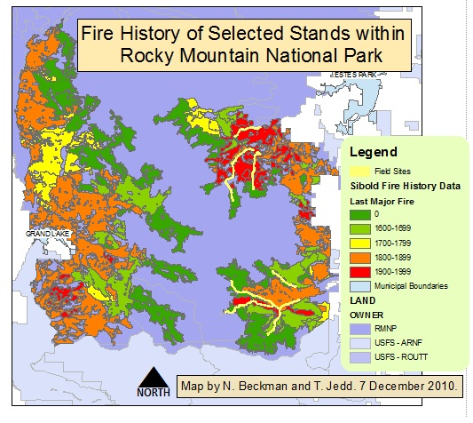 The map at right spatially depicts the fire history data we have obtained for forest stands within Rocky Mountain National Park.