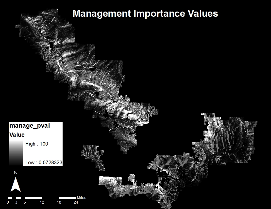 Resulting component value GRIDs were added together using Raster Calculator to get the final Management Importance Value GRID.