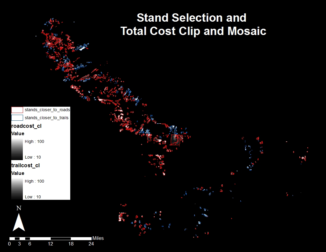 The total management cost raster with the distance cost from roads was then clipped to the extent of those stands closer to roads using Data Management -> Raster -> Raster Processing -> Clip with the clip to feature geometry option. The same was repeated for the total management cost with the distance cost from trails using the stands closer to road for the clip layer. The resulting GRIDs were then mosaicked using the Mosaic to new raster function.