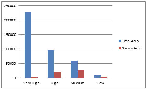 Proportion of total area surveyed for each malaria risk area. Medium and low risk areas