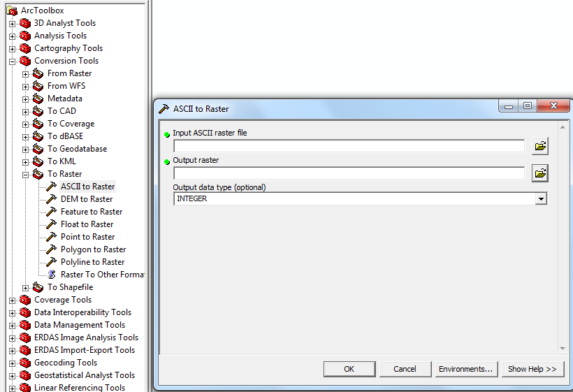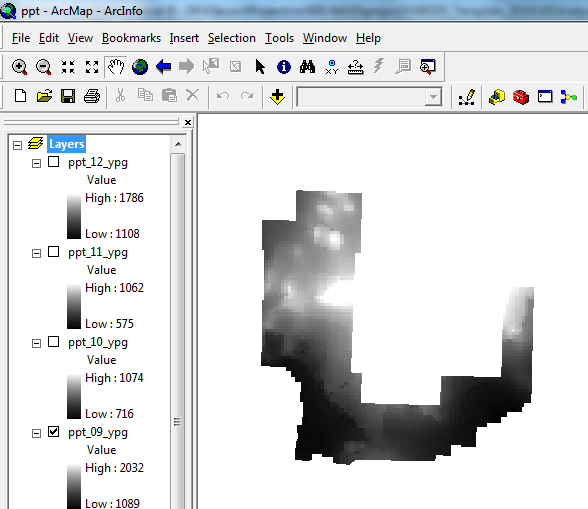PRISM Data comes in a file with a name like us_tmax_2009.##, or us_ppt_1971_2000.##, where ## indicates the month (01-12). The problem with this is that the average computer thinks that each file is a .01 or .02 file (etc). So, the files were all renamed with an underscore replacing the period and a .txt at the end (us_tmax_2009_##.txt). They were then turned into a raster on arcmap using the ascII to raster command: