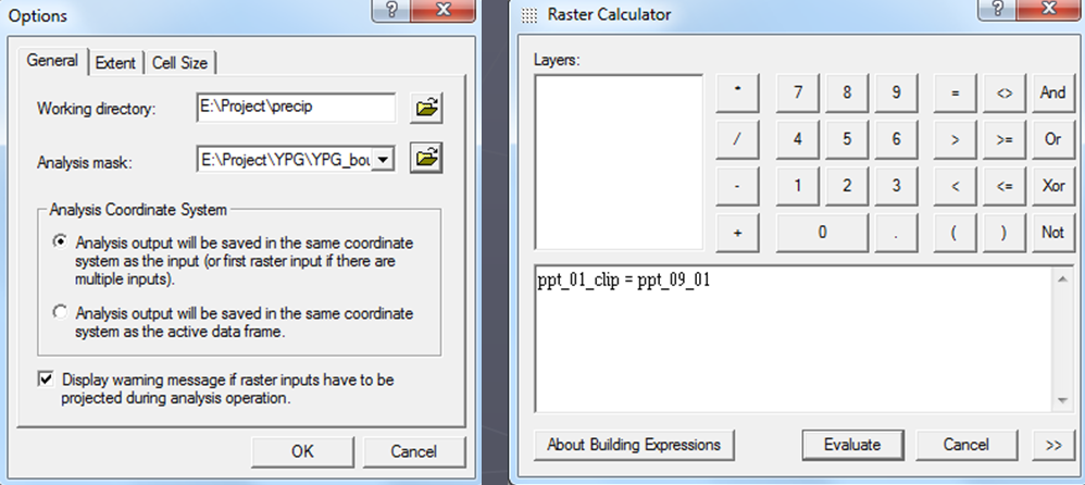 The data must then be clipped using the raster calculator on the spatial analyst tool. To do this, spatial analyst was activated, then the spatial analyst toolbox was brought up. The analysis mask and extent were both set to the YPG Boundary, which is appropriately named. Then, using the raster calculator, a new name is given to the new raster, and the prism rasters are born.