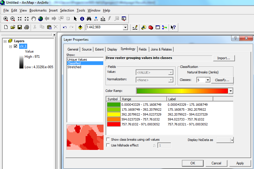 To get the colored maps, one raster (called clr_1 for precipitation data and clr for max temperature data) was created from one of the other rasters, and using map algebra and the raster calculator, this raster was made to have pixels whose values ranged from the lowest value out of all 12 months to the highest value out of all 12 months. After right clicking and selecting properties and going to the symbology tab, a then clicking “classified,” a classification system was created for this dummy raster, and then imported into all of the other rasters. It is in this way that all the pictures in the results section are rated using the same rating system for precipitation and maximum temperature.