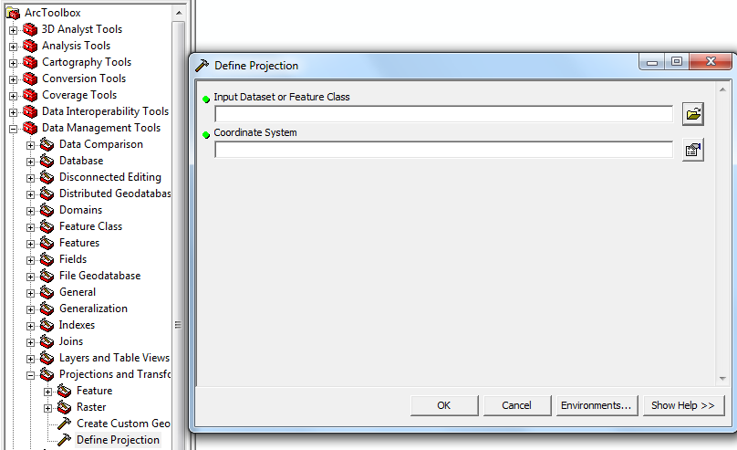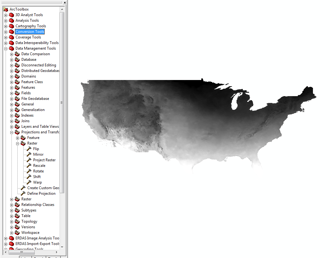 Once they were imported into ArcMap in the form of a raster file, a define projection was performed.
