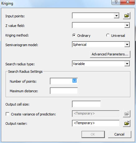 To create a raster by kriging, Spatial Analyst is once again used. From the Spatial Analyst toolbar, the “interpolate to raster” option was selected, then “kriging.”