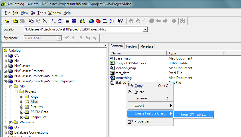 To create the weather station shape file, a .txt file was created with the latitude and longitude coordinates written down for each station. To turn them into a shape file, ArcCatalog was opened, the file was located, and after right clicking and “create feature class” was selected, then “from XY table.” Then the file was turned into a shape file with points on it.