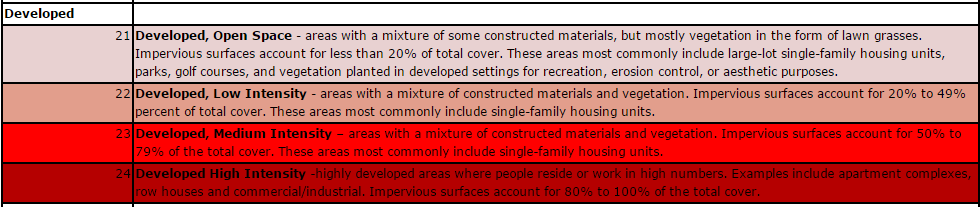The NLCD also provides a legend to let users know what certain colors mean. We were mainly concerned with anything pertaining to development, which was classified as follows: