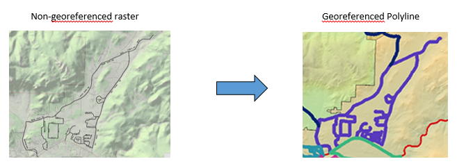 To digitize the maps, the first step in this intricate process involved using an extremely helpful tool called the Georeferencing Tool. This tool allowed us to upload a non-georeferenced jpeg picture as a raster, and “snap” it to a spatially referenced location (Estes Park, CO) using a series of control points (road intersections). We snapped images for 7 different jpeg maps before receiving an e-mail from the Park Service ArcGIS expert with all the digitized routes we needed within a shapefile, which included 10 routes.