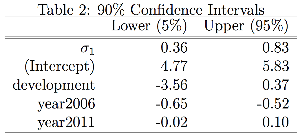 Additionally, below is a table for the 90% confidence interval of the coefficients for the fixed effects in the model.