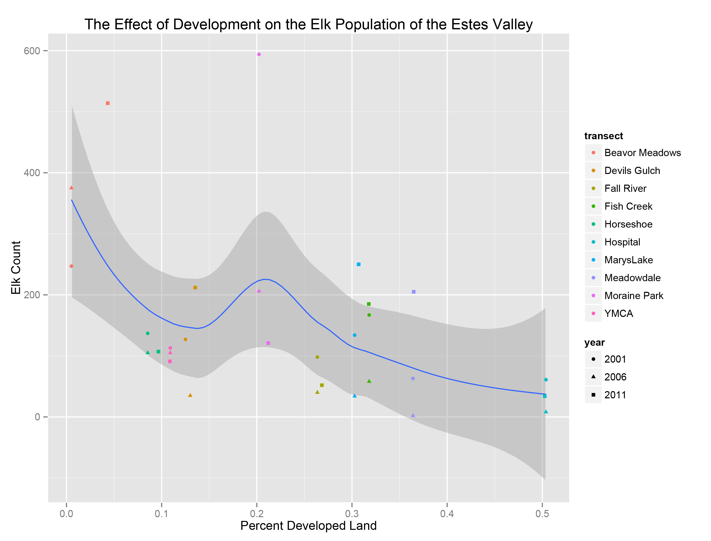 The following graph shows the number of elk counted versus the percent of developed land by transect (shown in different colors) and year (shown in different shapes). The curve and resulting confidence interval are the result of fitting a loess smoother function to the data. As we can see, the data do appear to have a negative relationship with regards to elk population within a region and the percent development, i.e. the higher the development, the lower the elk count.