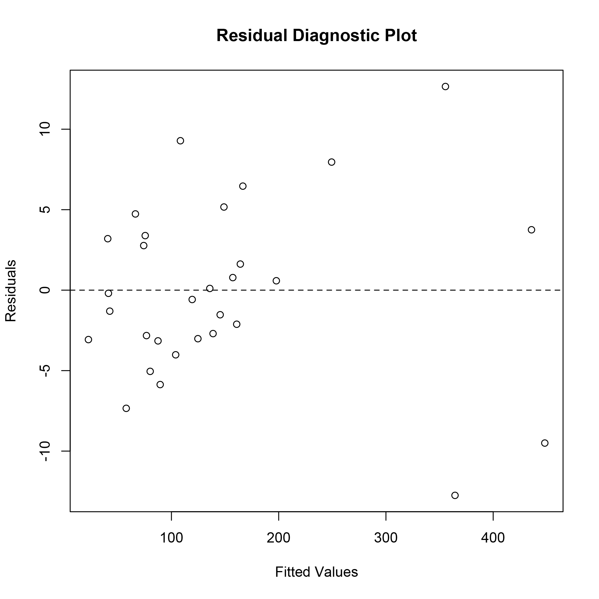 High variability of the response variable led to relatively wide confidence intervals. However, standard diagnostics did not reveal any heteroskedasticity or violations of independence. The following plot of the residuals shows no issues with the model fit, except for the high variability as seen in the range of the residual values. A chi-square test for over-dispersion was statistically significant (Χ2 = 36.93, p < 0.0001). This indicates that the assumption of equal moments for the Poisson distribution is violated. This is not uncommon for data arriving from processes observed in nature. A zero-inflated Poisson may provide a better fit to this data but was not explored in this analysis.