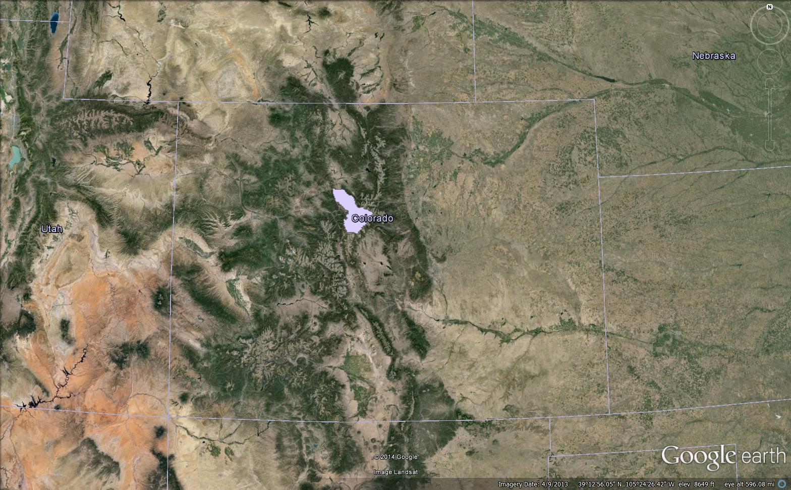 Summit County, Colorado is highlighed on this Google Earth image, showing the terrain and state boundaries around our study area.