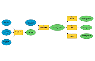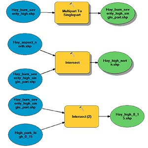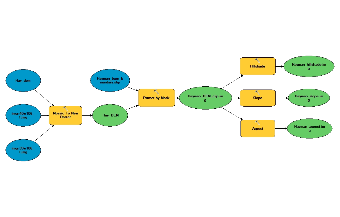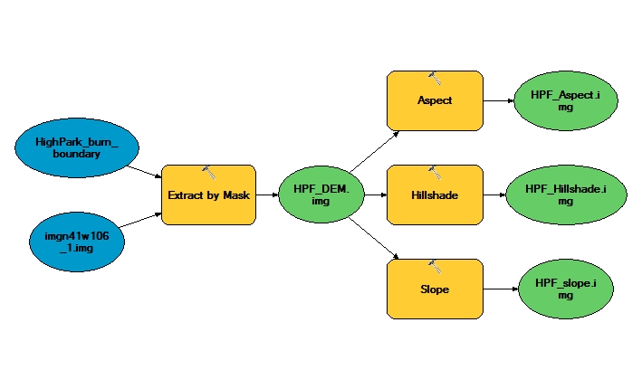 Using the downloaded elevation files from the U.S.G.S., the first step was to clip files to burn boundaries. This was done using the “extract by mask” tool. Next, we created three new rasters for each fire; these were the aspect, hillshade, and slope files. Each of these tools (aspect, hillshade and slope) create an output raster file. See figure 1 for the model displaying methods of extraction and raster creation for the High Park Fire. Remember, the High Park Fire original files were not projected, so the burn boundary has “UTM13” at the end of its name to confirm the projected file was used.