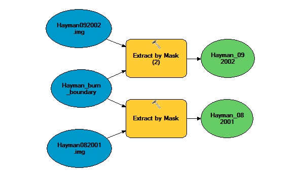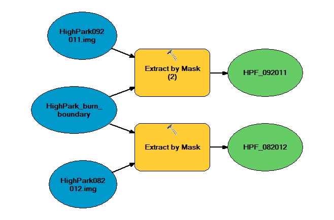 The vegetation analyses utilized Landsat imagery. Imagery was downloaded for two dates for each fire. One image was downloaded from the August before the fire, and the second image was from the September post-fire. We chose these files, because they were close enough in season, to eliminate any vegetation differences due to growing season. As both fires occurred in June, September was as soon after the fire as could be downloaded with high quality data. The first step, as with the topographic analyses, was to extract these files by the burn boundaries. See figure 3 for a model displaying extraction of the High Park Fire imagery, and see figure 4 for a model displaying extraction of the Hayman Fire imagery.