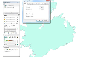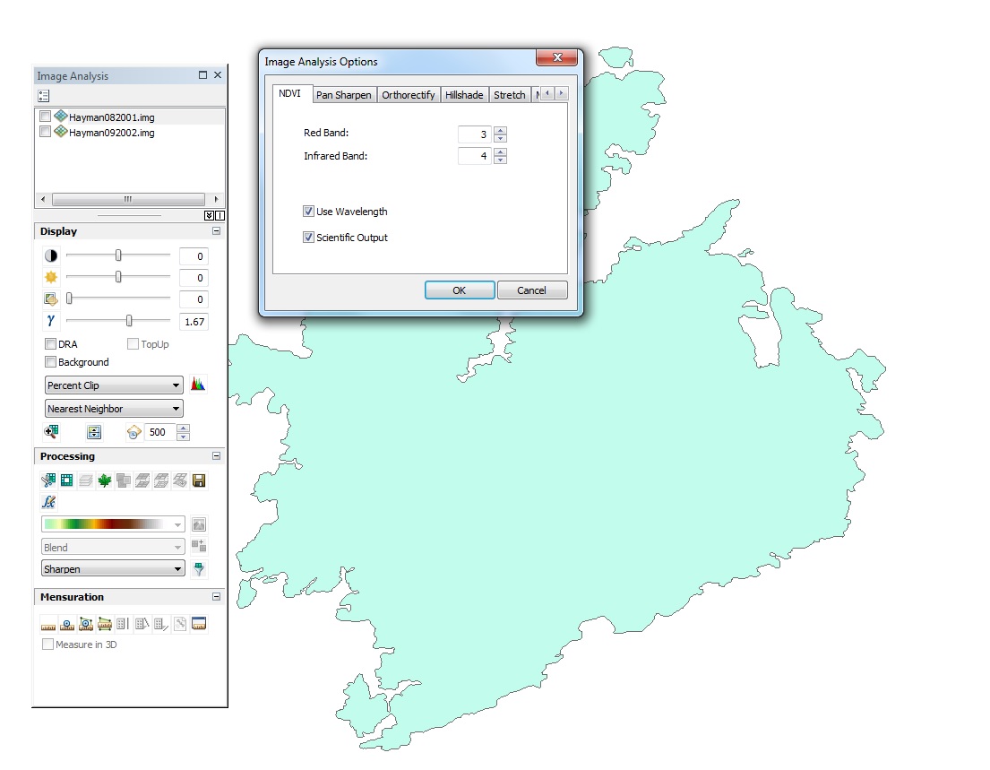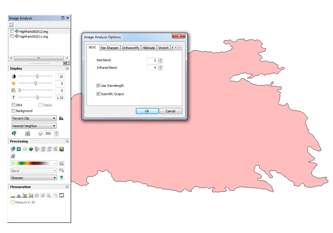 After clipping the LandSat imagery to fire boundaries, for each date, the Normalized Difference Vegetation Index was calculated. This can be done from the “Image Analysis” window of ArcGIS. From this window, one must first set the “Image Analysis Options” so that the Red Band is represented by band 3 and the Infared Band is represented by band 4. After setting these options, one can simply press the NDVI icon to create an NDVI layer for each image. This was done four times, once for each of the two dates for each of the two fires. Figure 5 shows this window and icon for the High Park Fire, and figure 6 shows this window and icon for the Hayman Fire.