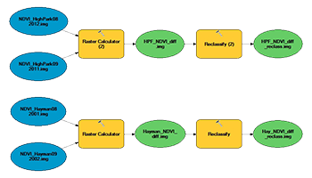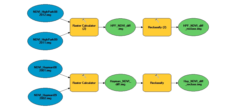 After creation of NDVI layer files, these files can be used to calculate the difference in vegetation before and after the fire. To do this, raster calculator and reclassify were used, see figure 7 for a model displaying the steps to create a vegetation difference for each fire. The raster calculator equation was the NDVI layer post-fire minus the NDVI layer pre-fire. Then, the result would give the difference in vegetation, showing a negative number where vegetation decreased and a positive number where vegetation increased. These files were then reclassified to a binary 1 or 0 showing an increase or decrease in vegetation.