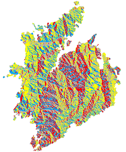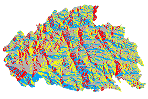 The slope and aspect raster files were then reclassified into four categories for each (0-15 degrees, 15-30 degrees, 30-45 degrees, and above 45 degrees for the slope; East, South, West, and North for the aspect) using the reclassify tool.