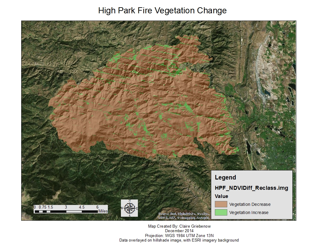 LandSat imagery was used to analyze the vegetation change pre- and post-fires. In order to minimize seasonal bias, the image dates were from the August prior to each fire and the September following each fire (each fire occurred in June). As expected, there was significant amounts of vegetation loss with both fires (see Table below). The Hayman fire showed a decrease in over 99% of the area within the burned boundary. The High Park fire showed a decrease in over 91% of the area within the burned boundary. As the severity maps were created by different methods, it is difficult to infer a relationship between burn severity and vegetation increase or decrease, and compare directly between the two fires. Figures 8 and 9 display maps of the burned areas and their vegetation change.