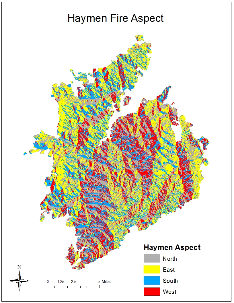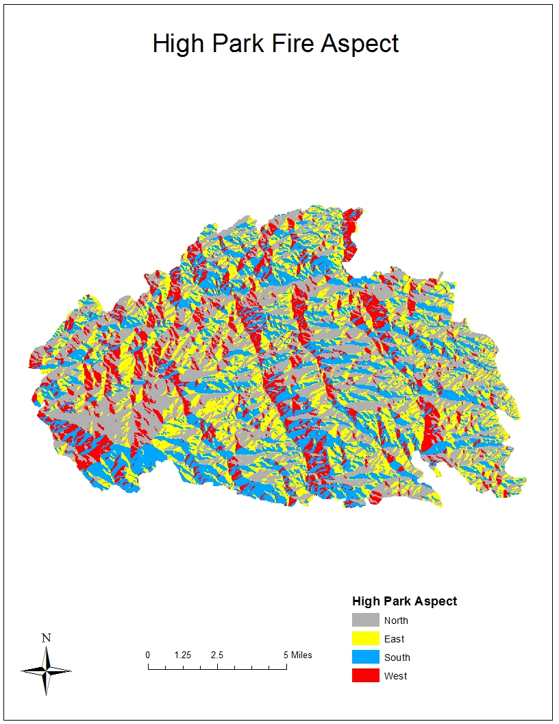 30% of high severity areas were on east facing slopes. 21% of high severity areas were on west slopes. 24% of high severities were on south slopes. 25% of high severity areas were on north facing slopes. This information suggests that aspect was not a significant factor in determining fire severity for the Hayman fire.