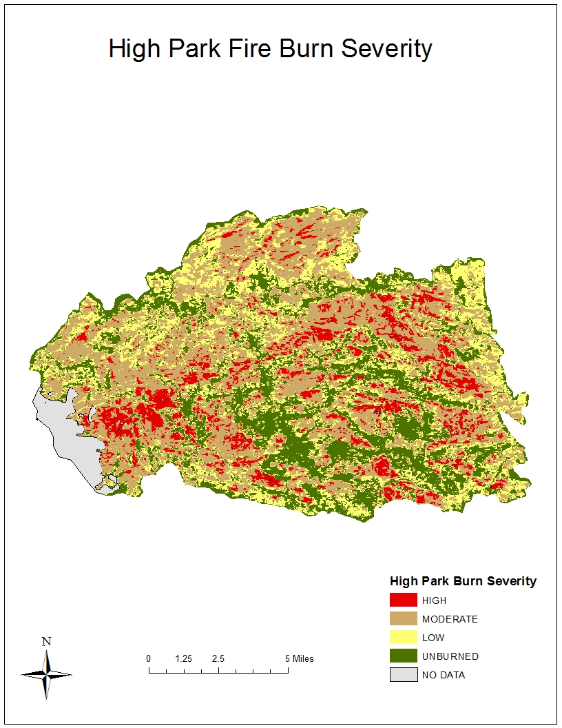 For this project, data was acquired from several sources. Burn boundaries were acquired from the high Park Fire Burned Area Emergency Response Team and U.S. Geological Survey. These files were used to clip other data and to define study area boundaries.