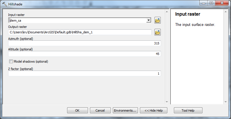 The DEM was used as the input parameter, and the Altitude parameter was left at the default of 45 degrees. After repeating this process eight times, we then averaged the hillshades together using raster calculator. ![]() Each of the eight hillshade rasters was summed using raster calculator, and then the ouput was then divided by eight. This produced a hillshade that simulated omnidirectional lighting, and highlighted contours in the landscape. This hillshade plus the DEM symbolized using ESRI's Elevation #1 color stretch was used as the base map for the control group. Simplified Hillshades