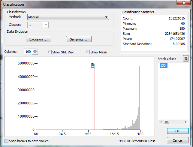 We classified the image so that any pixel with a brightness value above 130 became a "1," and any pixel with a brightness value lower than 130 became a "0." Using this image, we ran successive itterations of the Majority filter and a Low Pass filter to remove excess noise.