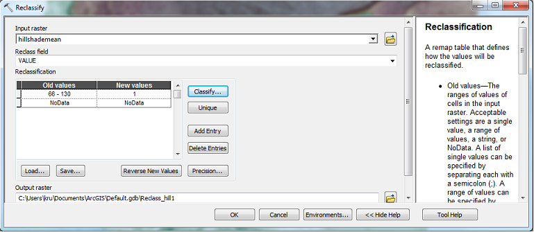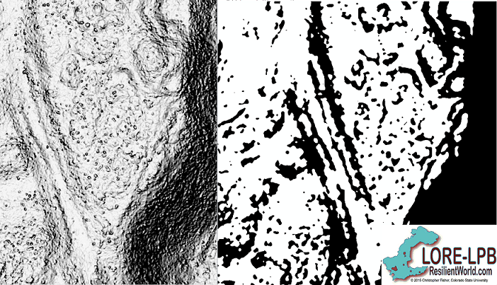 Although the multi-look hillshade is effective enough for human observation, the MRS algorithm was less effective at analyzing this raster due to level of detail in the image. Small rocks, tree trunks, and bushes obscured architecture and hindered the ability of the algorithm to segment the image properly. To counteract this, we ran a number of filters on this hillshade to simplify it and remove surplus noise, while leaving major contours and architecture. We started with the "Reclassify" tool to break the grayscale image of the hillshade into a binary black-and-white raster.