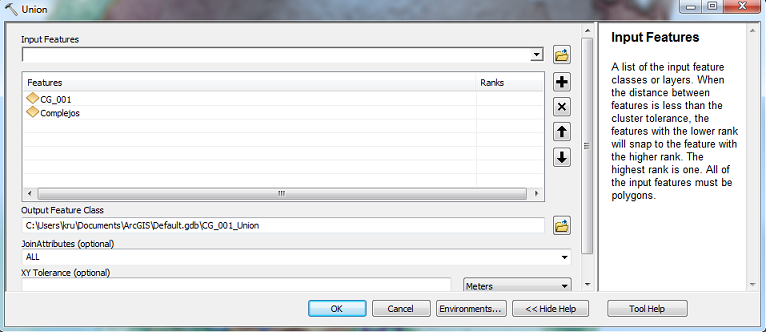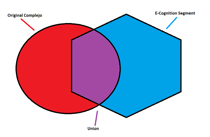From this table we were able to calculate size ratio as the ratio of the area of the two polygon layers before the union. Mean overlap was calculated as the area of the largest union for each complejo divided by the area of the orignal complejo polygon and the sample polygon in question, averaged. For clarification, refer to the following diagram: